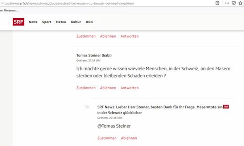 Mit Mail vom 25. April 2019 hat Frau X gegen einen Kommentar auf SRF News zur Impfdebatte Beanstandung eingereicht. Sie kritisiert die von SRF News verfasste Antwort einen Kommentarschreiber «Maserntote sind in der Schweiz glücklicher» (siehe Screenshot).