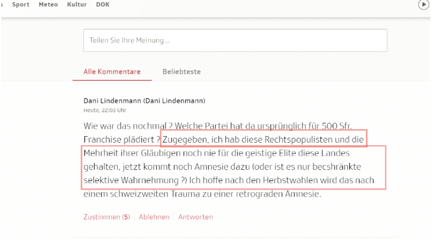 «Ich beanstande und lege wert auf das Wortwörtlich Zitat...Ich beanstande die Terroristen von SRFNews. Dieser Kommentar (vgl. Fussnote 1) wurde vom den SRFTerroristen freisgeschaltet. Mit einer übelsten Diffamierung an die SVP und deren Wählerschaft. Vollständigen Verstoss gegen die Neitquette