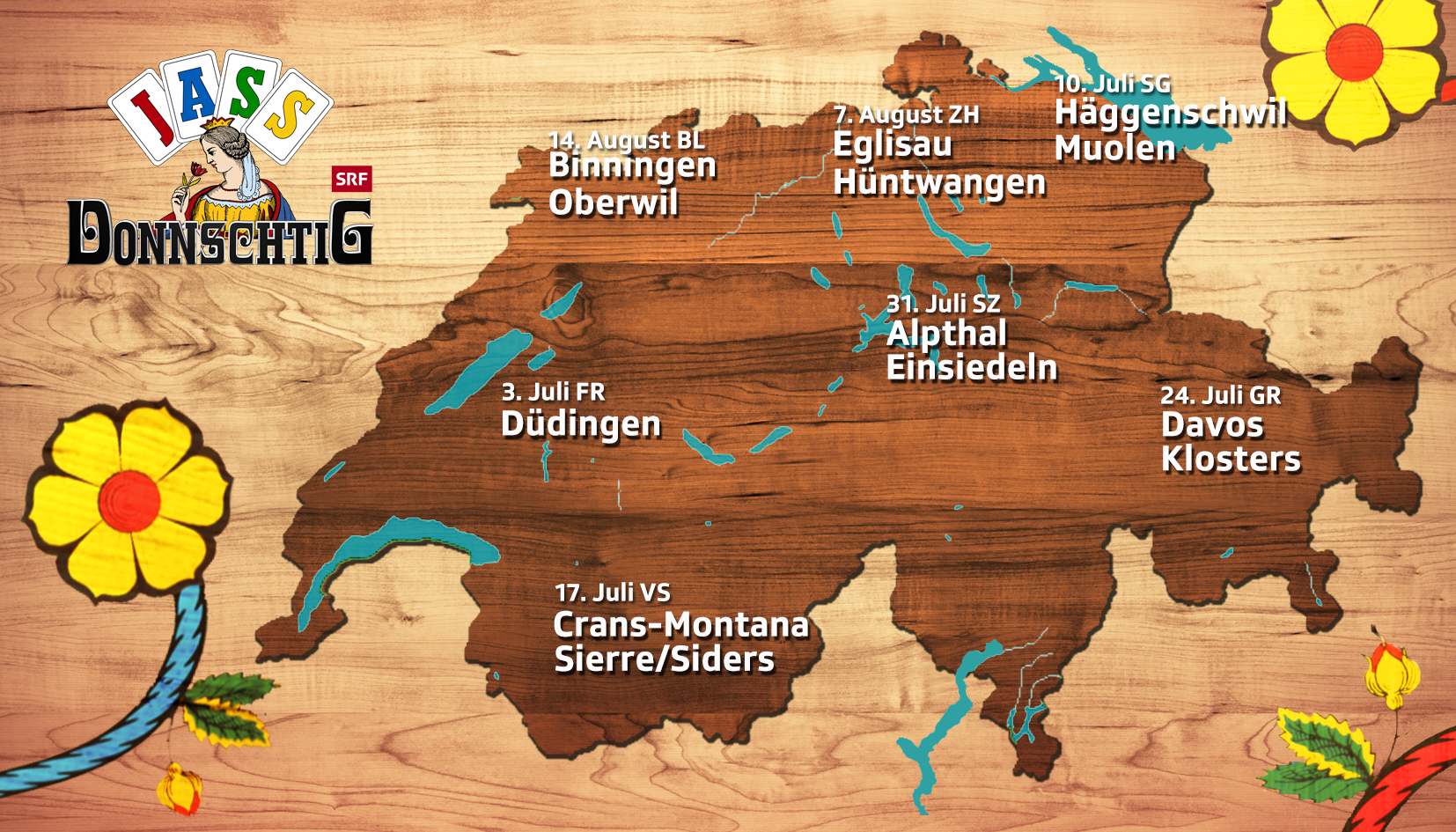 Seit 42 Jahren pflegt der «Donnschtig-Jass» die Jass-Kultur in der Schweiz, lässt das Publikum daran teilhaben und verbindet Tradition mit Spiel und Spass. Vom 3. Juli bis zum 14. August 2025 ist die Jass-Sendung wieder auf grosser Schweizer Tour. Das Publikum erwartet beste Unterhaltung – mit Jass-Wettkämpfen, musikalischen Highlights und prominenten Persönlichkeiten.
