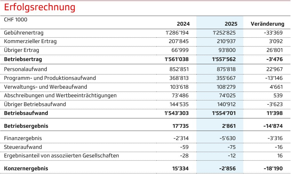 Die SRG erwirtschaftete 2025 einen Betriebsertrag von 1,56 Milliarden Franken und schloss das Jahr mit einem Verlust von 2,9 Millionen Franken ab. Der Ertrag aus der Medienabgabe ist im Vergleich zum Vorjahr um 33,4 Millionen Franken gesunken. Der reine Werbeertrag liegt 4,1 Millionen Franken unter dem Vorjahreswert. Der Rückgang konnte im Berichtsjahr jedoch durch Sponsoringeinnahmen bei Sportgrossereignissen und dank dem ESC etwas abgefedert werden. Hingegen sind die Programmerträge – zum Beispiel durch höhere Erträge aus Weitersendungsrechten – um 7,0 Millionen Franken höher als im Vorjahr und somit der kommerzielle Ertrag insgesamt um 3,1 Millionen Franken gestiegen. Deutlich zulegen konnte auch der übrige Betriebsertrag mit plus 26,8 Millionen Franken, unter anderem im Zusammenhang mit Dienstleistungen rund um die Übertragung des ESC sowie dank eines Immobilienverkaufsgewinns.