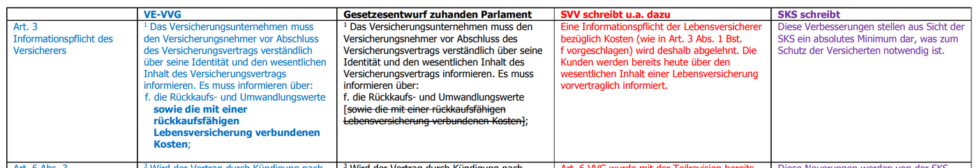 Auf der bereits erwähnten Website20 ist zudem eine zehnseitige Übersicht zu finden, bei der «Änderungen in der Vernehmlassung und ihre Folgen» übersichtlich aufgelistet sind. Dort werden die entsprechenden Artikel aufgeführt, dazu der Gesetzesentwurf zuhanden des Parlaments, eine Spalte «SVV schreibt u.a. dazu» sowie eine Spalte «SKS schreibt dazu».