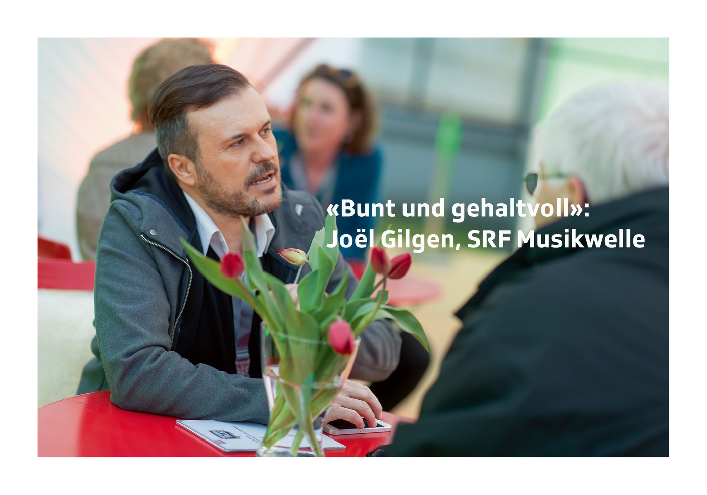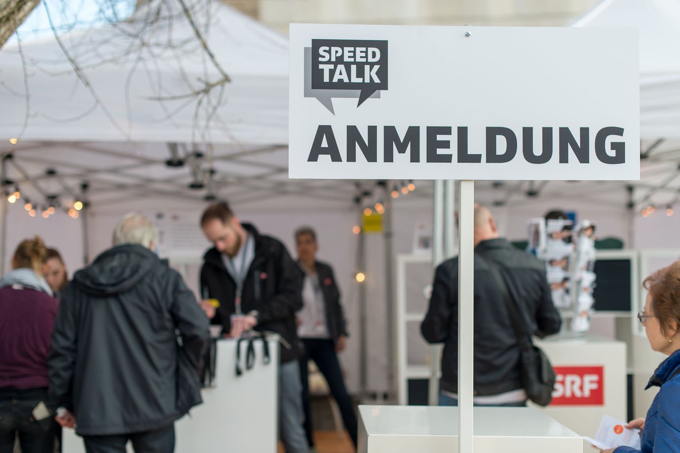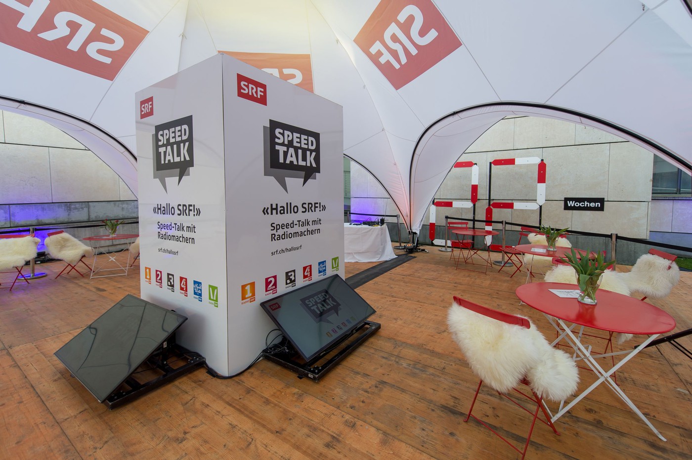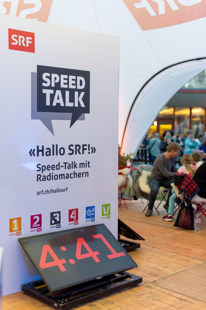 Wohl jeder hat seine Lieblingssprecher. Zwei Schulmädchen wollen unbedingt zu SRF 1-Moderator Reto Scherrer. Mein erster Gesprächspartner wird Musikwellen-Moderator Joël Gilgen sein. Da ich erst im nächsten Gesprächsturnus an der Reihe bin, stelle ich mich zum Publikum vor das Zelt und lausche in die Gespräche hinein. Sarah und Malin, die Reto Scherrer-Fans, knipsen gerade Selfies. «Und? Was möchtet ihr fragen?», höre ich Scherrers Stimme. «Nichts. Wir wollen dir von unserer Pyjamaparty erzählen und dich dazu einladen.» Noch bevor ich die Antwort mitbekomme, wird mein Platz bei Joël Gilgen frei. Ich muss sofort zu seinem Tischchen, sonst beginnt mein fünfminütiges Date am Ende noch ohne mich. Die Countdown-Uhr kennt keine Gnade.