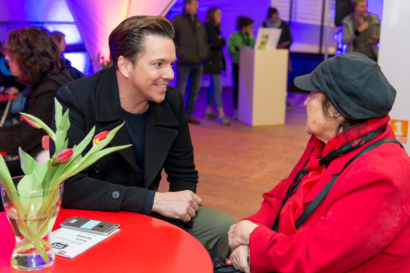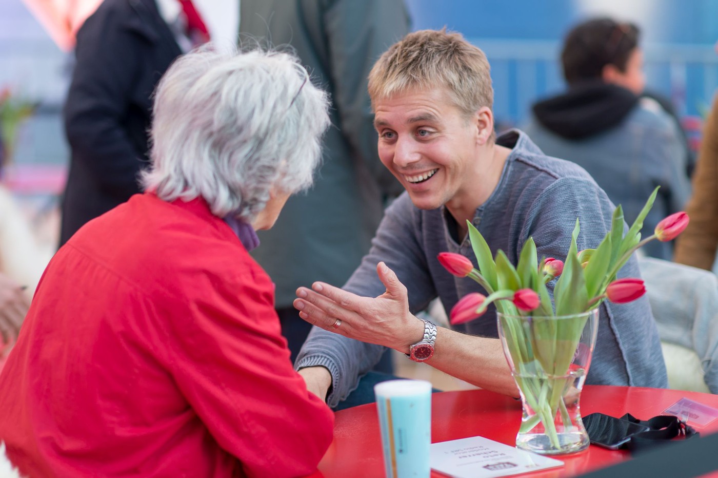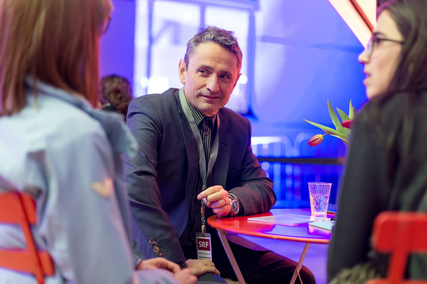 Wohl jeder hat seine Lieblingssprecher. Zwei Schulmädchen wollen unbedingt zu SRF 1-Moderator Reto Scherrer. Mein erster Gesprächspartner wird Musikwellen-Moderator Joël Gilgen sein. Da ich erst im nächsten Gesprächsturnus an der Reihe bin, stelle ich mich zum Publikum vor das Zelt und lausche in die Gespräche hinein. Sarah und Malin, die Reto Scherrer-Fans, knipsen gerade Selfies. «Und? Was möchtet ihr fragen?», höre ich Scherrers Stimme. «Nichts. Wir wollen dir von unserer Pyjamaparty erzählen und dich dazu einladen.» Noch bevor ich die Antwort mitbekomme, wird mein Platz bei Joël Gilgen frei. Ich muss sofort zu seinem Tischchen, sonst beginnt mein fünfminütiges Date am Ende noch ohne mich. Die Countdown-Uhr kennt keine Gnade.