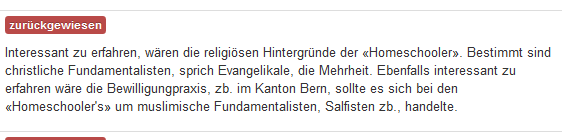 Dass die Erwähnung von Homeschooler'n in Verbindung mit christlichen Fundamentalisten, sprich Evangelikalen nicht erlaubt sein soll, hält keiner seriösen Überprüfung stand. Dies ungeachtet der Tatsache, dass ich lediglich die Ansicht vertrat, dass unter Homeschooler'n mit religiösem Hintergrund die Evangelikalen bestimmt in der Mehrheit sind. Auch die Frage, wie denn der Kanton Bern zb. mögliche Anfragen von muslimischen Fundamentalisten, sprich Salafisten beurteilen würde, kann doch beim besten Willen nicht als Polemik erachtet und folglich mit dem Zensurknüppel begegnet werden.