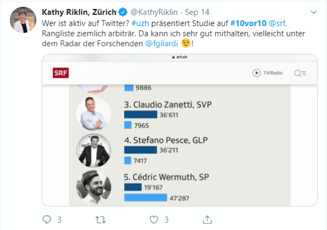 Kathy Riklin von der CVP enervierte sich währenddessen, dass bei unserem Ranking aufgrund der gewählten Zählweise drei SVP-ler als die erfolgreichsten Twitterer erschienen: