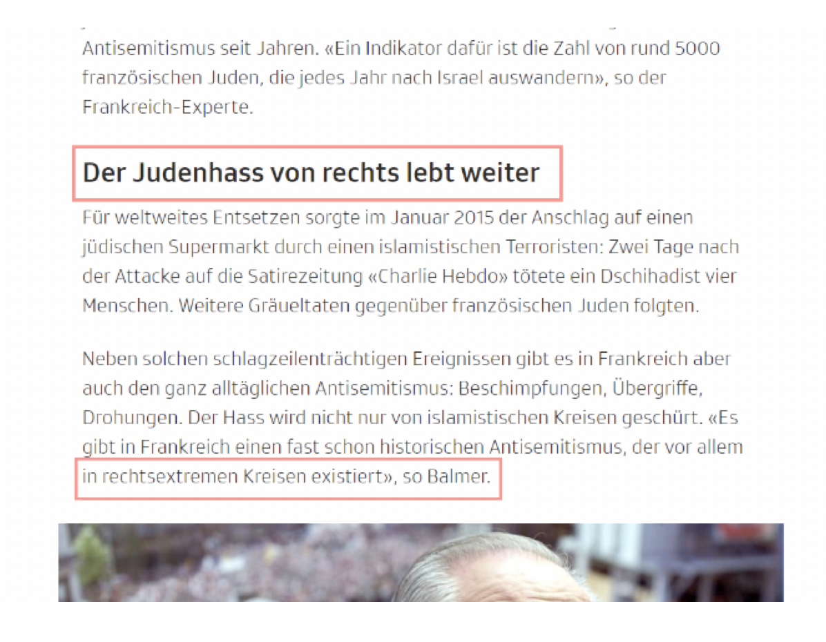 Mit dieser fett gedruckten Überschrift mit der Behauptung von SRF Mitarbeiter Balmer hetzt SRFNews. Sugestivsatz Rechts = Judenhass. Weiter unten präzisiert dieser Balmer zwar auf <Rechtsextreme> Aber
