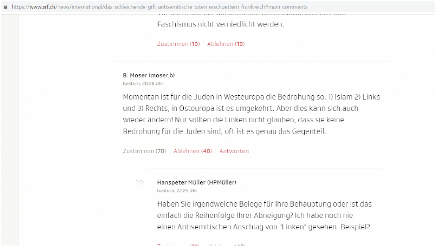 Ich hatte 5 Minuten für diese Beweise herauszusuchen, dass der Judenhass sehr wohl auch ein Linksextretremes, Problem ist. und von den linken Parteien. Das ist ein ganz klarer Verfassungsbruch der objektiven Berichterstattung, wo nicht willentlich Fakten zurückgehalten werden. Einmal mehr hat dies SRF nur aus Gründen der Volksverhetzung so gemacht. Auch hier liefere ich Ihnen gerne den Beweis aus den Kommentarforen: