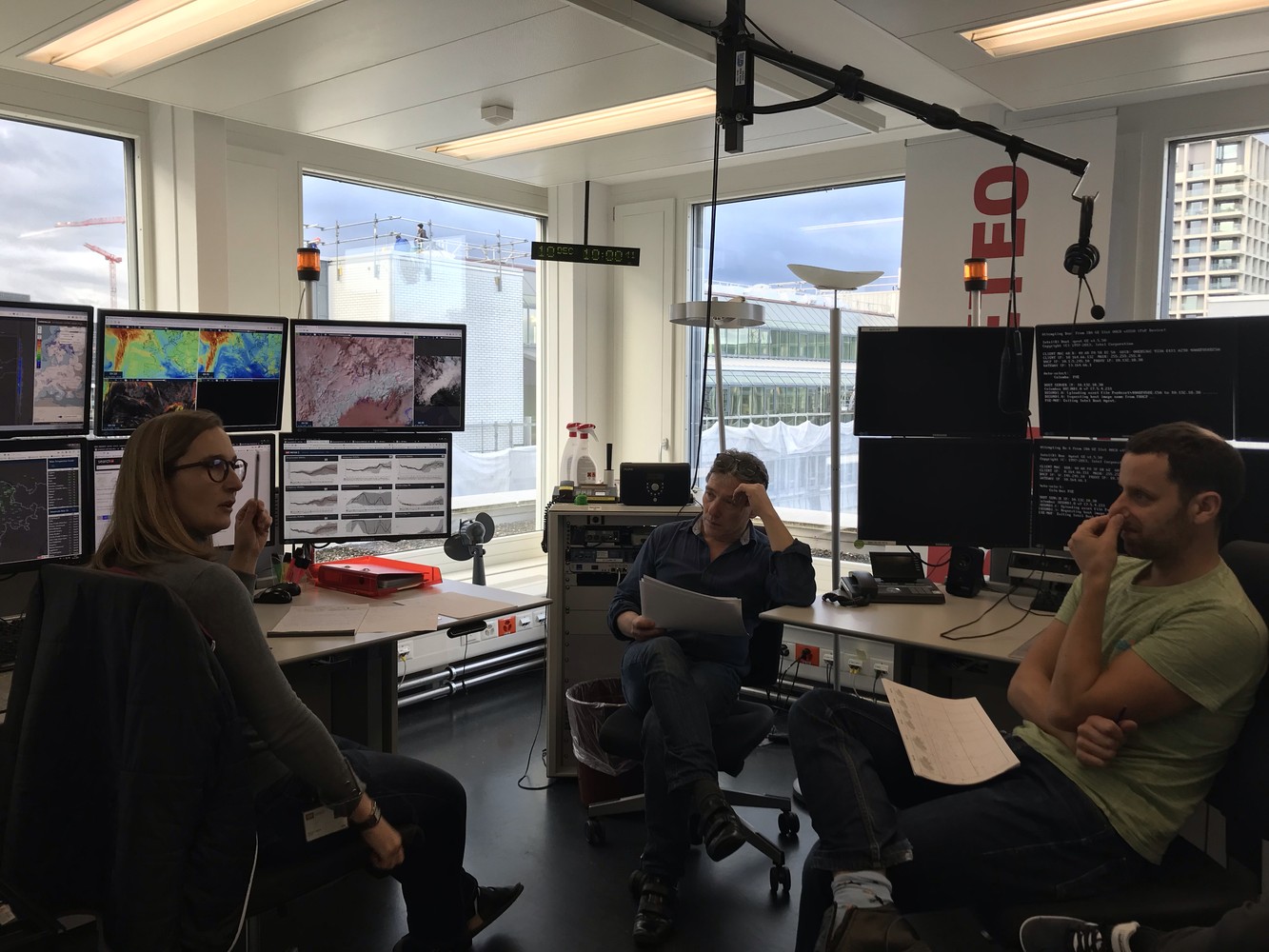 09.55 Uhr: Alle anwesenden Meteo-Mitarbeiter treffen sich, um die Wetterlage zu besprechen. Luzian leitet dabei die Diskussion, da er nach fast sieben Stunden intensiver Auseinandersetzung am besten «im Wetter drin ist». Er übergibt vor seinem Feierabend seine Prognosen seinen Kollegen und sie diskutieren gemeinsam den weiteren Wetterverlauf. Dabei sind sie sich nicht immer ganz einig, da beim Modellstudium viel Raum für Interpretation bleibt.