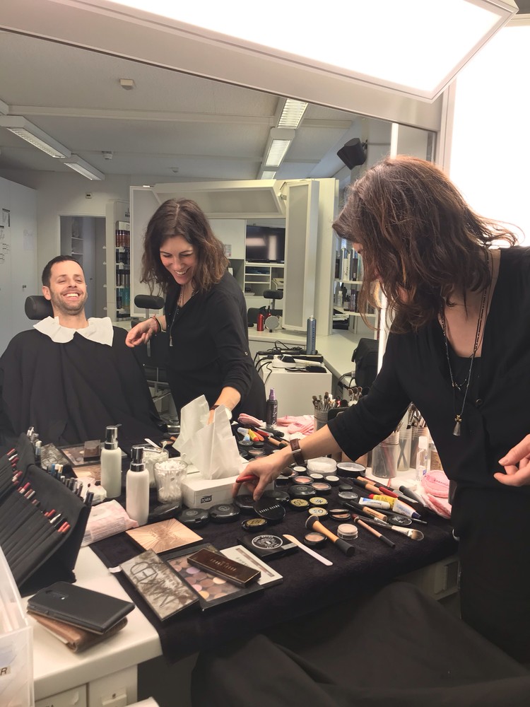 10.30 Uhr: Während Luzian sich auf den Nachhauseweg macht, geht es für Gaudenz in die Maske. Er wird für die Kamera hergerichtet. Etwas Puder ins Gesicht, ein paar Rötungen abdecken und etwas Gel ins Haar. Nach nicht mal zehn Minuten ist Gaudenz schon bereit, vor die Kamera zu treten.