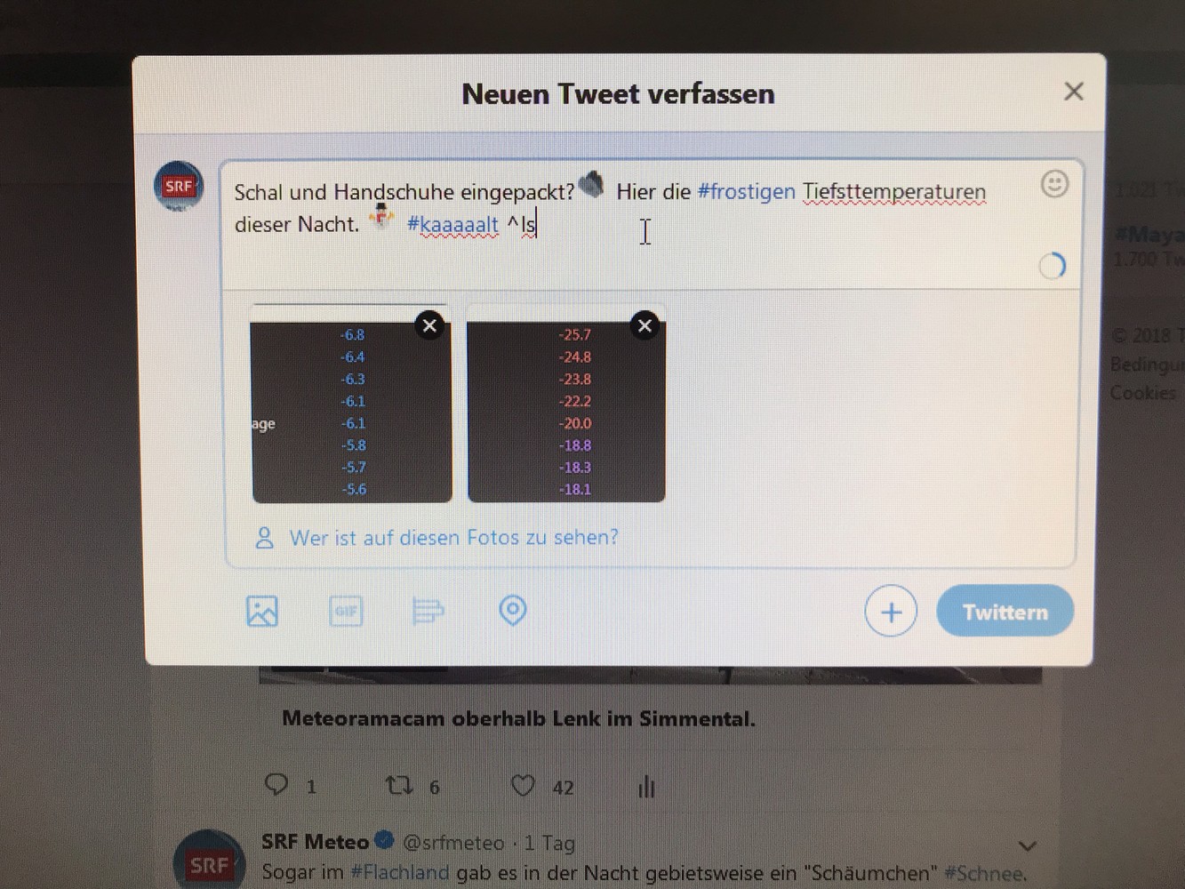 06.02 Uhr: Mir schwirrt bereits der Kopf. Vier Interviews in einer halben Stunde. Doch Luzian nimmt es gelassen. Vor den Interviews bleibt sogar noch Zeit für Sprüche und Spässchen mit den Moderatoren. Weiter geht’s mit einer Online-Wetterprognose speziell fürs Engadin – ebenfalls ein externer Kunde – und mit einem Morgentweet für den SRF-Meteo-Twitteraccount.
