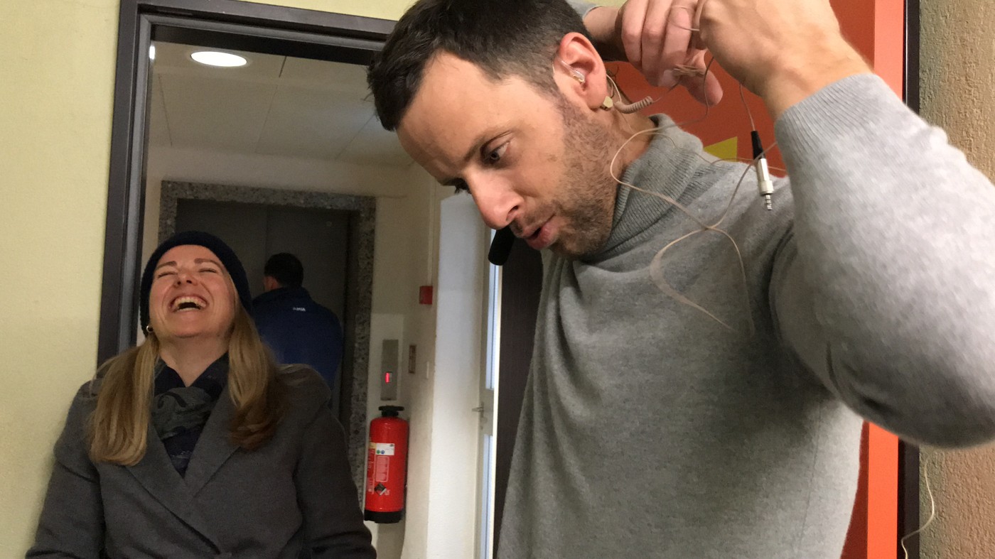 05.27 Uhr: Jetzt gilt es ernst. Zum ersten von insgesamt 17 Mal an diesem Morgen, geht Luzian im Radio live auf Sendung. Er setzt seine Kopfhörer auf, drückt einen Knopf und schon ist er direkt mit Tina Nägeli im SRF-3-Studio verbunden. «Frag mich, wie kalt es werden wird», gibt Luzian Tina das Leitthema der Prognose an und wartet dann auf seinen Einsatz. Er schaltet auf seine Moderatorenstimme um: «Ja, es ist sehr kalt. Wir haben aktuell gerade -5 bis -3 Grad, aber noch deutlich kälter ist es zum Beispiel im Oberengadin. In Samedan haben wir aktuell gerade -24.5 Grad». Luzian spricht frei. Er orientiert sich bloss an seinen Notizen.