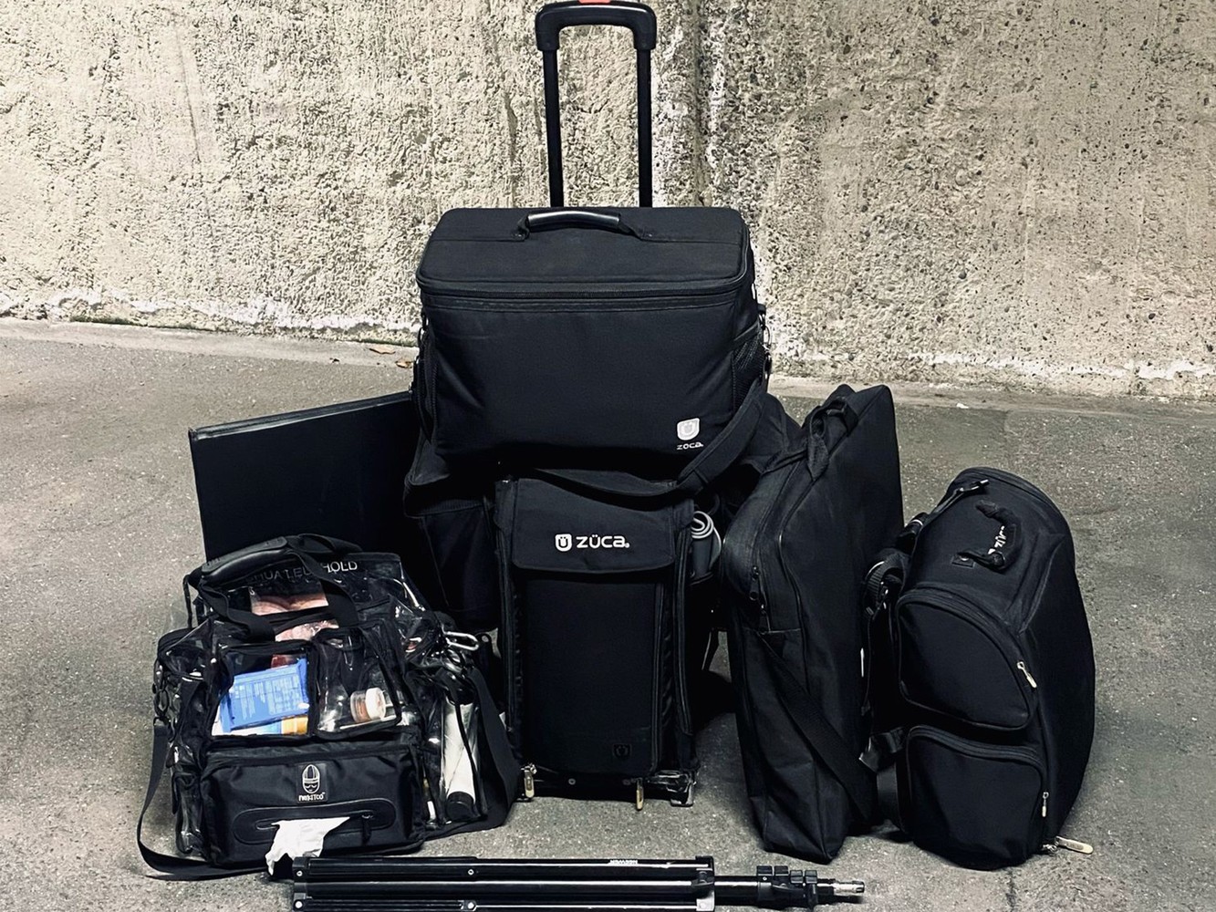 Damit das gelingt, nehmen sich die Visagist:innen von SRF Zeit im hauseigenen Atelier und teils auch während der Sendungen im Studio. Doch wie sieht dies aus, wenn eine Sendung im Freien aufgenommen wird? Dafür hat jede Maskenbildner:in den eigenen Schminkkoffer, Schminktaschen, Taschen für Haarutensilien, Licht und Spiegel mit dabei. Der Schminkkoffer alleine wiegt zwischen 15 und 20 Kilogramm, insgesamt sind es bis zu 40 Kilogramm (!) Gepäck pro Person. Beim Dreh im Feld ist dann jeweils ein:e oder mehrere Visagist:innen dabei und kümmern sich um die Personen, die vor der Kamera stehen.