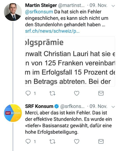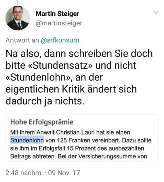 Der auf Medienrecht spezialisierte Rechtsanwalt Lic.iur. Martin Steiger hat die Redaktion des offiziellen Twitter-Kanals ‚SRF Konsum‘ am 09.11.2017 mehrmalig darauf hingewiesen, dass die Formulierung ‚Stundenlohn‘ sachlich und faktisch falsch sei; da facto handelt es sich um einen Stundensatz, nicht Stundenlohn. [Siehe Screenshot 1 – 3]