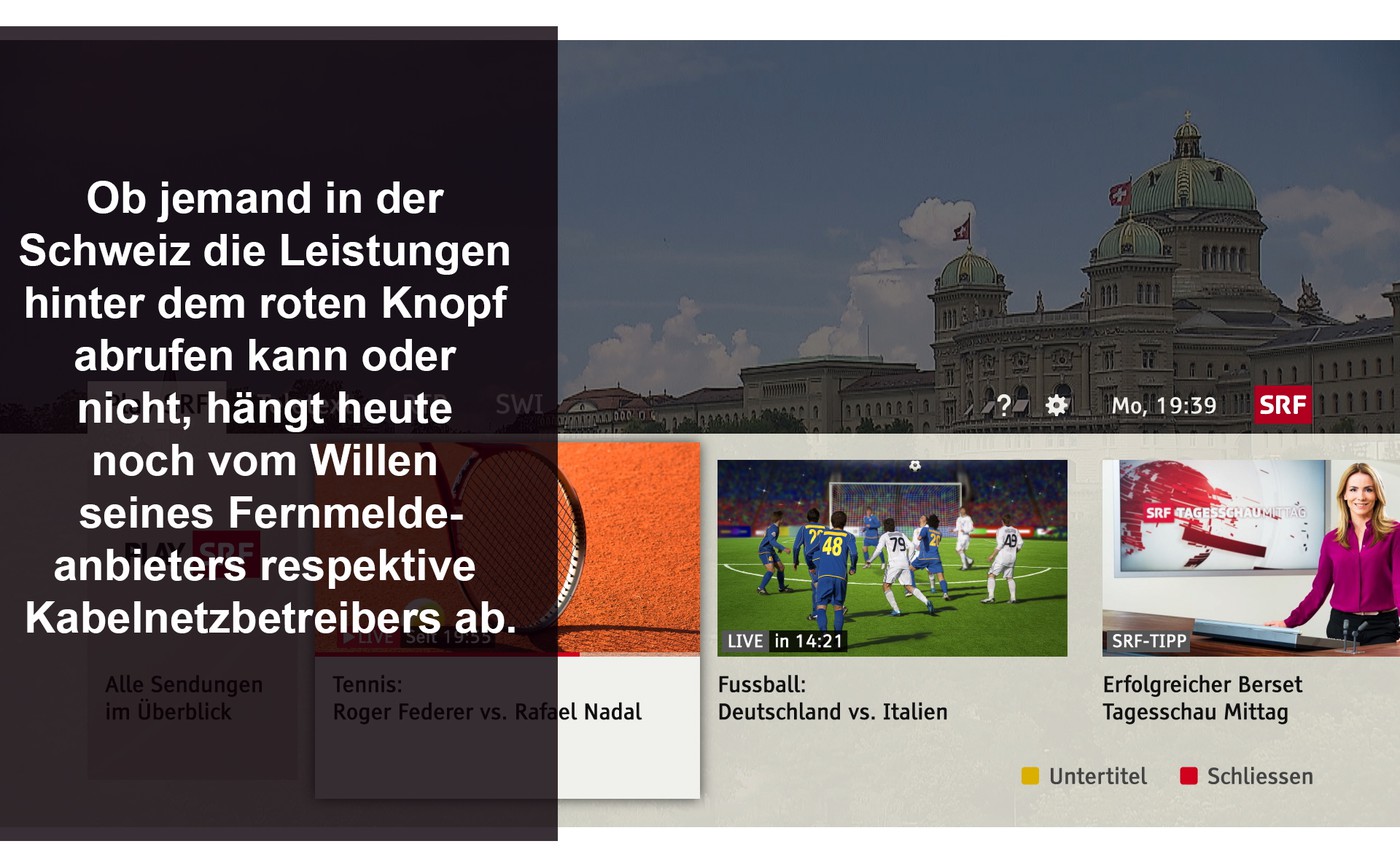 Der rote Knopf öffnet eine Pforte, die bislang nicht vorhanden war, weil es hinter der Sendung nichts zu sehen oder hören gab. Und für Menschen mit einer Sinnesbehinderung öffnet sich mit ihm eine Barriere. Es gibt ihn heute auf praktisch jeder Fernbedienung eines Geräts der jüngeren Generation. Aber nicht jeder rote Knopf führt zum Ziel; noch nicht. Die Sache ist politisch und einigermassen komplex. Es ist nämlich so, dass SRF (ebenso wie die meisten öffentlich-rechtlichen und viele private Sender in Deutschland, Frankreich und anderen europäischen Ländern) die Inhalte fürs intelligente Hybrid-TV zwar erstellt und liefert – diese aber nicht zu jedem Nutzer durchkommen. Ob jemand in der Schweiz die Leistungen hinter dem roten Knopf abrufen kann oder nicht, hängt heute noch vom Willen seines Fernmeldeanbieters respektive Kabelnetzbetreibers ab, denn eine rechtliche Regelung gibt es noch nicht. So kommen beispielsweise Sunrise-Kunden noch nicht in den Genuss von HbbTV, jene von Swisscom seit einem Jahr hingegen schon, jedenfalls mit den neueren Boxen der TV-2.0-Generation, sagt Martin Spycher.