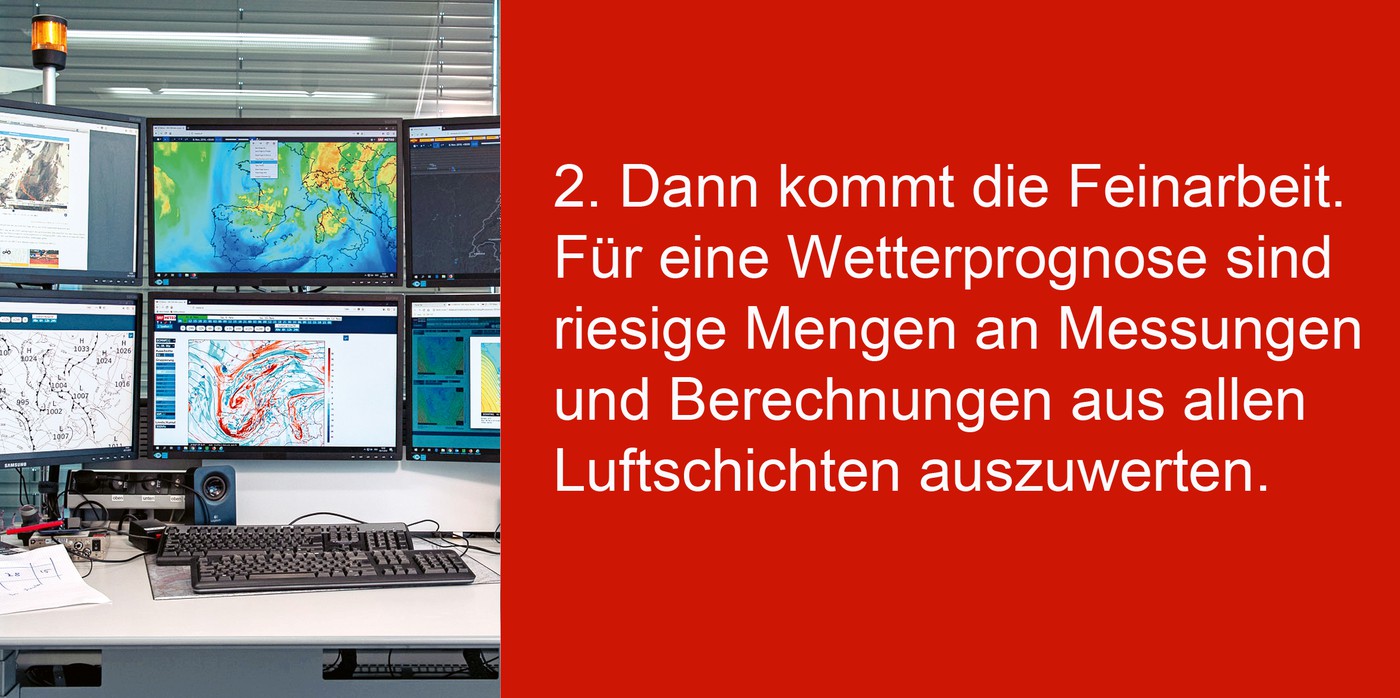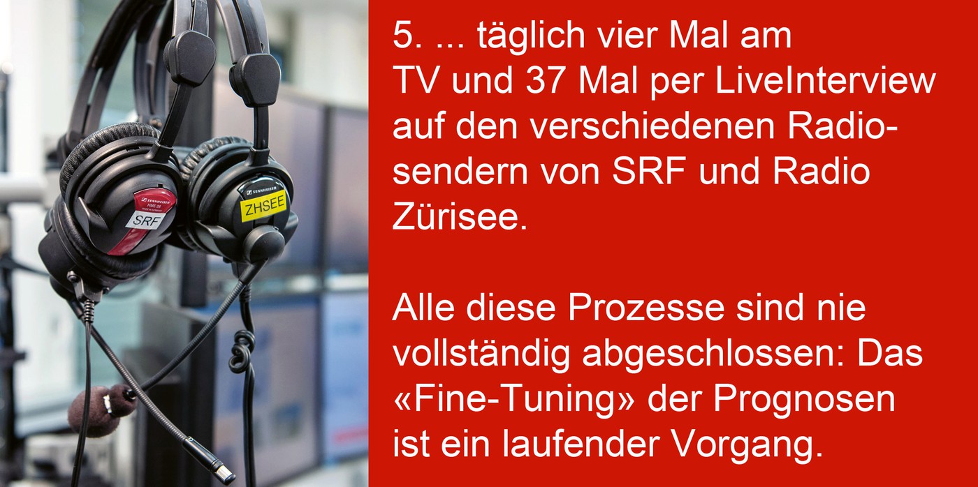 Die Wettermodelle sind die Basis jeder Prognose. Sie sind in den letzten Jahrzehnten immer feinmaschiger geworden. «Will jemand beispielsweise auf den Titlis, können wir ihm heutzutage sehr detaillierte Prognosen liefern», sagt Bucheli. Für die Live-Sendungen müssen die Wettermacher aber trotzdem zusammenfassen, und zwar so, dass sich der Walliser in der Sendung genauso wiederfindet wie die Baslerin. Am Ende der Sendung bleibt immer auch Zeit für einen persönlich gefärbten Input: Christoph Siegrist, Sabine Balmer und Thomas Bucheli erklären gerne meteorologische Phänomene, Jan Eitel ist Spezialist für Winde, während Sandra Boner das Wetter bevorzugt mit gesellschaftlichen oder landwirtschaftlichen Aspekten verknüpft. «Als Einzige unter uns habe ich kein naturwissenschaftliches Studium absolviert und sehe mich daher eher für die praktischen Dinge zuständig», sagt Boner. Wiederum andere Akzente setzen die Umweltwissenschaftlerin Nicole Glaus, der Physiker Ivo Sonderegger und überhaupt das ganze Team von SRF Meteo am Radio und am TV. Auch «private» Kompetenzen fliessen immer mal wieder in die Prognosen ein, sei es von den Sportfreaks Felix Blumer und Gaudenz Flury oder vom Hobby-Winzer Jürg Zogg. All diese unterschiedlichen Hintergründe sind gewünscht. Jeder setzt einen etwas anderen Schwerpunkt – und das bietet dem Publikum zusätzlichen Mehrwert. Eines haben die SRF-Meteo-Leute alle gemein: ihre grosse Leidenschaft für das Wetter.
