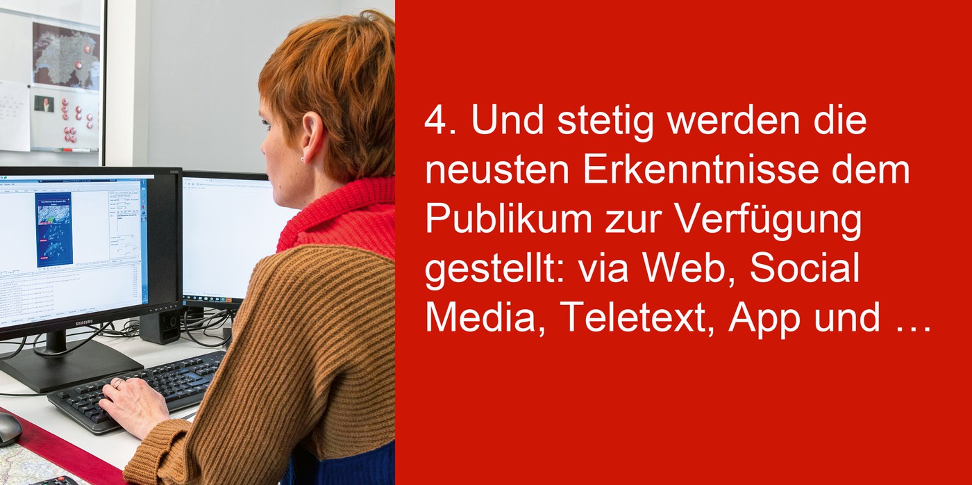 Dies gilt erst recht bei gefährlichen Wetterlagen und wenn gezielte Warnungen notwendig werden; dann sind lokale Kenntnisse der Meteorologen genauso gefragt wie Schnelligkeit und Präzision – auch für die Newssendungen im TV und Radio von SRF. Deutlich gezeigt hat das der Sturm «Lothar» 1999. Er brachte buchstäblich neuen Wind in die Arbeitsabläufe von SRF Meteo. Bis zu «Lothar» waren die Meteorologen geneigt, gewisse Modelle als eher «minderwertig» zu taxieren. Was dazu führte, dass genau dem Modell zu wenig Beachtung geschenkt wurde, das den Sturm als Einziges korrekt berechnet hatte. Seit diesem Ereignis setzt SRF Meteo bei der Beurteilung der kommenden Wetterentwicklung auf «Ausreisser»-Vorschläge ein besonderes Augenmerk: Es könnte ja durchaus so kommen! «Lothar» war zudem auch die Geburtsstunde des «Wetter-Alarm»: Anfangs noch per SMS, heute per App, werden die Kunden vor aufziehenden Unwettern und vor Wettergefahren frühzeitig gewarnt und können entsprechende Vorkehrungen treffen.