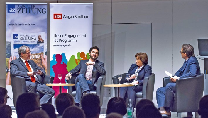 Diese RTVG-Revision, die am 14. Juni zur Abstimmung kommen wird, war Thema eines Abstimmungspodiums, zu welchem am 24. April die SRG Aargau Solothurn sowie die «az Aargauer Zeitung» ins Kultur- und Kongresszentrum Aarau eingeladen hatten. Neben der Medienministerin begrüssten die Podiumsleiter Peter Moor- Trevisan (Präsident SRG AG SO) und Christian Dorer (Chefredaktor az Aargauer Zeitung) zwei weitere Politiker: auf der Befürworterseite der neuen Gebührenordnung SP-Nationalrat Cédric Wermuth und auf der gegnerischen Seite Sylvia Flückiger- Bäni, SVP-Nationalrätin und Vizepräsidentin des Aargauer Gewerbeverbandes.