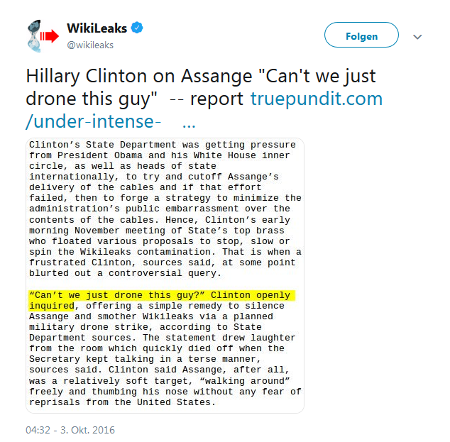 Er stellt das angebliche russische Kapitalverbrechen als ‚potenzielle Überläufer abschreckenden plausiblen Signalmord‘ dar – als würden solche nicht mitbekommen wenn andere Überläufer plötzlich überraschend serienweise ‚Selbstmord‘ begingen – und erwähnt süffisant, dass Präsident Putin den offensichtlichen Landesverräter Skripal öffentlich ehrlich einen ‚Dreckskerl‘ genannt hat jedoch beispielsweise nicht, dass Hillary Clinton in vertrautem Kreis über den mutigen Whistleblower Julian Assange (un)heimlich gesagt hatte: <Can’t we just drone this guy!> (vgl. Bild links). Derweil erklärt die russische Regierung seit Monaten, dass sie bei der Aufklärung der ‚Causa Skripal‘ zur Zusammenarbeit [13] mit derjenigen Grossbritanniens bereit ist, dies von letzterer unter Verweis auf „Belange nationaler Sicherheit“ aber bis heute verweigert wird (vgl. Bild rechts).