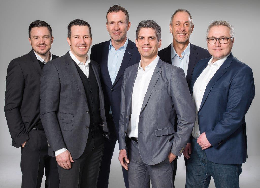 Bild: Benjamin Echaud (Teamleiter Sportsponsoring Die Mobiliar), Alex Sauber (Leiter Sponsoring und Events Die Mobiliar), Adrian Boss (Leiter Rechte, Business Unit Sport SRG SSR), Roland Mägerle (Leiter Business Unit Sport SRG SSR und Abteilungsleiter SRF Sport), Werner Augsburger (Präsident Indoor Sports Genossenschaft), Beat Ackermann (Geschäftsführer Indoor Sports Genossenschaft), v.l.n.r. (Foto: SRF/Oscar Alessio)