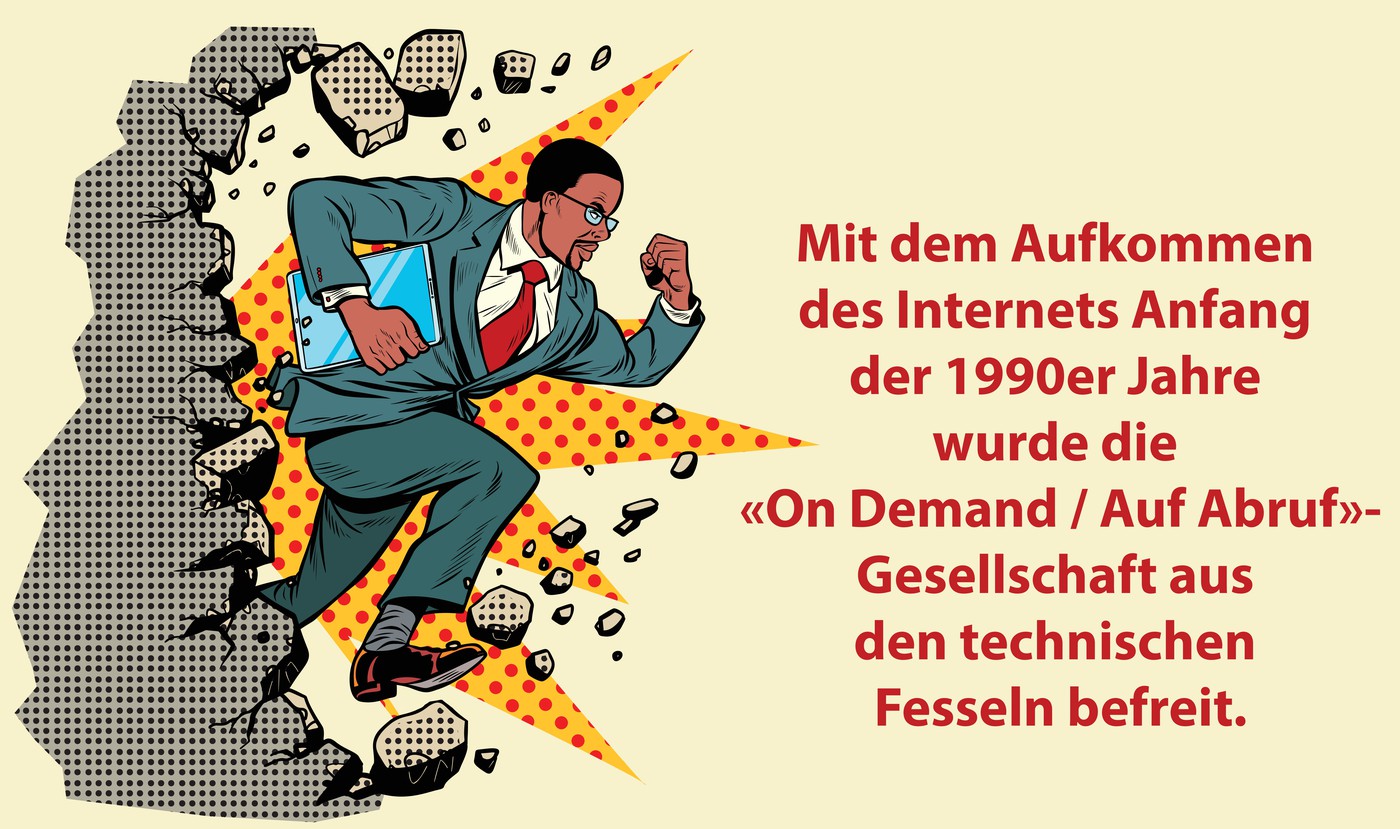 Mit dem Aufkommen des Internets Anfang der 1990er Jahre wurde die «On Demand / Auf Abruf»-Gesellschaft aus den technischen Fesseln befreit. Die Digitalisierung begann, die bestehenden Angebote an die Wand zu drücken. Die Aufmerksamkeitspanne der zu erreichenden Personen wurde mit jedem neuen Internetangebot kürzer und somit umkämpfter. Den Ursprung bildet zwar die Technik, diese wurde aber nur so schnell von der Gesellschaft umarmt, weil sie ein Grundbedürfnis der Selbstbestimmung deckte.