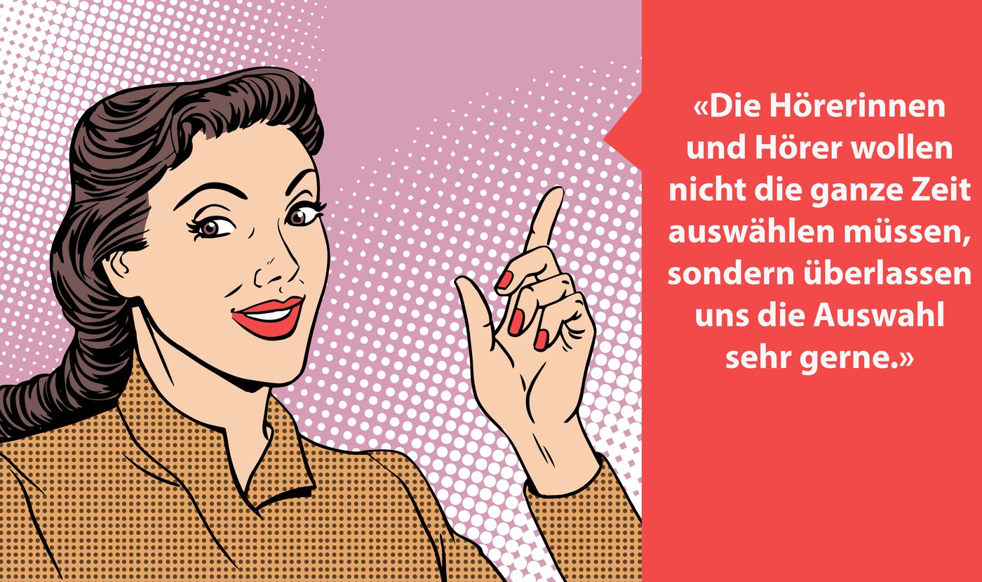 Durch die Globalisierung der Inhalte entsteht dann aber die noch grössere Herausforderung: Um Inhalte zu hören, müssen immense Mediatheken durchsucht werden. Dieses Auswählen ist noch mühsam und frustriert viele Nutzer*innen. Laut diversen wissenschaftlichen Studien sind die Kunden bei einer reduzierten Auswahl zufriedener als bei einem Überangebot.