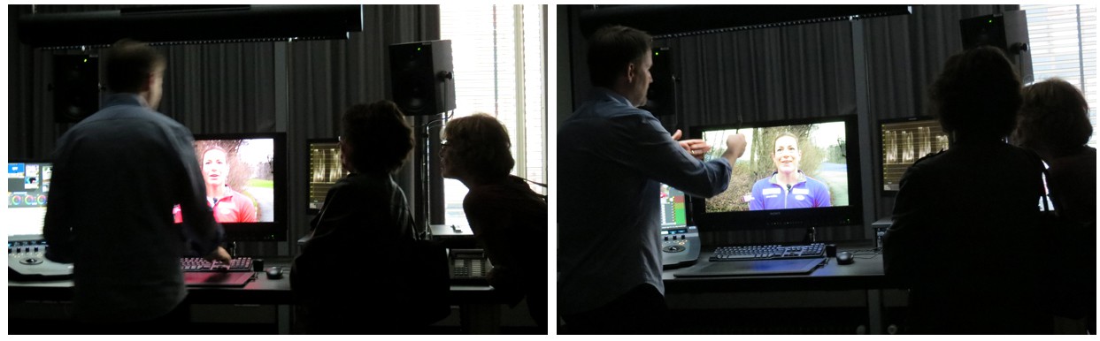 Im Dämmerlicht der Grading Suite von Videoeditor Martin Krattiger leuchtet Moderatorin Kiki Mäder grünstichig von den Monitoren – und wechselt ihre Wangenfarbe auf Knopfdruck in Zart-Rosé. Auf die subtile Verwandlung folgen plakativere Beispiele, die auch Fragen nach den Grenzen der Gestaltung aufwerfen. Die sind für die meisten erreicht, als Martin die Pulloverfarbe von Nicola Spirig von rot auf blau wechselt. «Was man bildtechnisch bereits mit einer nuancierten Farbkorrektur herausholen kann und muss, ist beeindruckend», bringt es eine Teilnehmerin auf den Punkt. «Ich werde ab jetzt ganz anders fernsehen.»