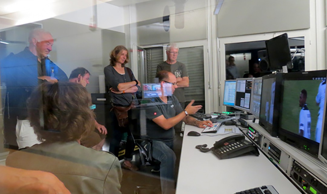 Selbst in die Hand nehmen und selbst Ausprobieren ist die Devise von Kameramann Philippe Schnyder, an der nächsten Station im Studio 2. Er hat ein ENG-Fahrzeug inklusive Kameras, Licht und Ton aufgebaut, erklärt Technik, Signalabgabe und das abwechslungsreiche Arbeitsleben eines Kameramanns. «Ich bin fasziniert», sagt eine Teilnehmerin. «In meiner Jugend wollte ich sehnlichst Kamerafrau werden. Damals war das undenkbar. Deshalb habe ich Fotografin gelernt und später privat angefangen zu filmen und zu schneiden. Heute zu sehen, wie perfekte Bilder entstehen ist für mich unheimlich spannend.» Eine andere Teilnehmerin ergänzt: «Am Fernsehen sieht man nur die Leute vor der Kamera. Heute sehen wir, wer und was an Knochenarbeit dahinter steckt.»Unter Strom für News und Sport