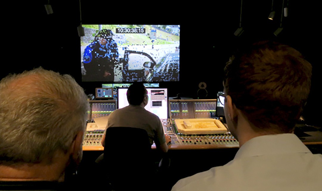 Vom Bild geht's in die Audiosuite. Kaum sitzen alle, scheint einen der aufbrausende Surround-Klang in die Mitte des Raums zu pressen. Audio Editor Manfred Gysi lässt hören, was Audio alles kann – und können muss: Töne bearbeiten, unterlegen, eliminieren, produzieren und imitieren. Zum Beispiel das Geräusch von Knirsch-Schnee, das der Audiotechniker mit einem Spezialinstrument erzeugt. Zwei junge Männer sind sich einig: «Wir hätten nicht erwartet, dass uns heute technisch etwas überrascht. Aber so eine Führung haben wir noch nie erlebt. Im Audio war einiges Neuland, zum Beispiel, dass Unterlegen von Naturgeräuschen.»