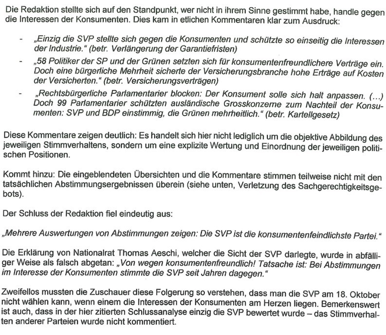 Das Ergebnis war interessant: Die SP stimmte immer für Konsumenteninteressen, FDP, Grüne, CVP, Grünliberale und BDP stimmten mal für und mal gegen Konsumenteninteressen. Auffallend jedoch war, dass die SVP fast immer gegen Konsumenteninteressen gestimmt hat. Mit diesem Befund hat «Kassensturz» aber nicht gegen das Ausgewogenheitsprinzip verstossen. Die Fakten stimmen, «Kassensturz» hat sie transparent dargelegt. Im Beitrag kamen zu den einzelnen Geschäften jeweils Politiker zu Wort, auch SVP-Politiker, die ihre Argumente vorbringen konnten. Thomas Aeschi konnte sein bestes Argument im «Kassensturz» präsentieren. Mit der Aussage ‚von wegen konsumentenfreundlich’ zog «Kassensturz» ein pointiertes Fazit am Ende des Beitrages. Im Hinblick auf die gebotene Zurückhaltung vor Wahlen war die Formulierung möglicherweise etwas gar zugespitzt. Die Zuschauer kennen «Kassensturz» aber als Sendung, die deutlich ihre Meinung vertritt und sich anwaltschaftlich auf die Seite der Konsumenten schlägt. Dieses Sendekonzept wurde vom Bundesgericht mehrfach geschützt. «Kassensturz» darf Partei ergreifen. Dieses pointierte Fazit am Schluss des Beitrags verstösst meiner Meinung nach nicht gegen die Konzession. Denn für die Zuschauer war klar, dass es sich um eine Wertung von «Kassensturz» handelt. Sie konnten sich eine eigene Meinung bilden. Das Sachgerechtigkeitsgebot wurde in jedem Fall eingehalten, weil die Fakten stimmen.