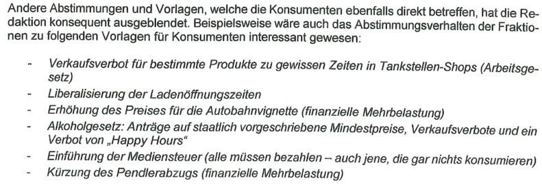 Wir haben andere Abstimmungen, wie sie die Beanstander aufführen, nicht bewertet, weil sie keine klassischen Konsumentenschutz-Themen behandeln. Liberalisierung der Ladenöffnungszeiten oder ein Verkaufsverbot von bestimmten Produkten zu gewissen Zeiten in Tankstellen-Shops schützen die Konsumenten nicht, belasten höchstens die Arbeitnehmer. Die Erhöhung des Preises für die Autobahnvignette hätte zwar den Autofahrer belastet, ihn aber als Steuerzahler gleichzeitig wieder entlastet. «Kassensturz» hat sich auf relevante Themen beschränkt, über die «Kassensturz» immer wieder berichtet und bei denen es eindeutig ist, welches Abstimmungsverhalten konsumentenfreundlich ist und welches nicht.