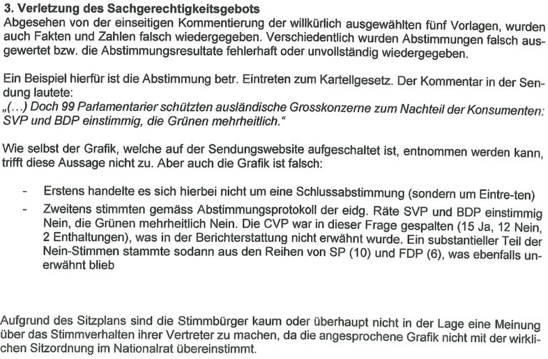 Sachgerechtigkeitsgebot: Analysiert man die Auswertung der fünf Abstimmungsresultate genau, stellt man verschiedene Ungenauigkeiten fest. Diese betreffen aber Detailfragen und sind nicht gravierend genug, um den Gesamteindruck wesentlich zu beeinflussen. Sie sind deshalb programmrechtlich nicht relevant. Bedeutender ist jedoch die Tatsache, dass die Berichterstattung auf die SVP fokussiert war. Aber dies gehört zu der unter „Ausgewogenheit“ erläuterten Einseitigkeit der Berichterstattung.
