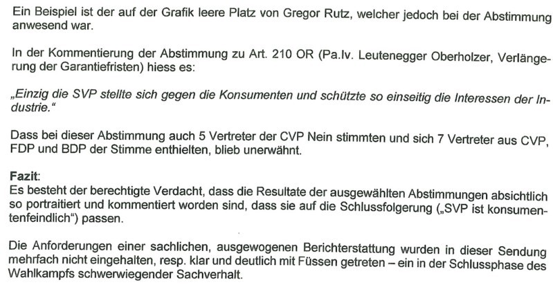 Stellungnahme: Es gehört zu den unbestrittenen journalistischen Pflichten, einer kritisierten Person oder Partei die Gelegenheit zu geben, Stellung zu beziehen. Dies ist vor allem unerlässlich, wenn es sich um eine Wahlsendung handelt. In der Sendung hatte zwar SVP-Nationalrat Thomas Aeschi die Gelegenheit, die Position seiner Partei kurz zu erläutern. Die SVP kämpft gegen Regulierungen und Bürokratie. Das führe zu tieferen Preisen. Die SVP betreibe deshalb konsumentenfreundliche Politik. Doch dem widersprach die Sprecherin: „Von wegen konsumentenfreundlich! Tatsache ist: bei Abstimmungen im Interesse der Konsumenten stimmte die SVP seit Jahren dagegen.“ Diese Formulierung ist nicht nur „möglicherweise etwas gar zugespitzt“, wie von Herrn Wettstein zugegeben, sondern in einer Wahlsendung schlicht inakzeptabel.