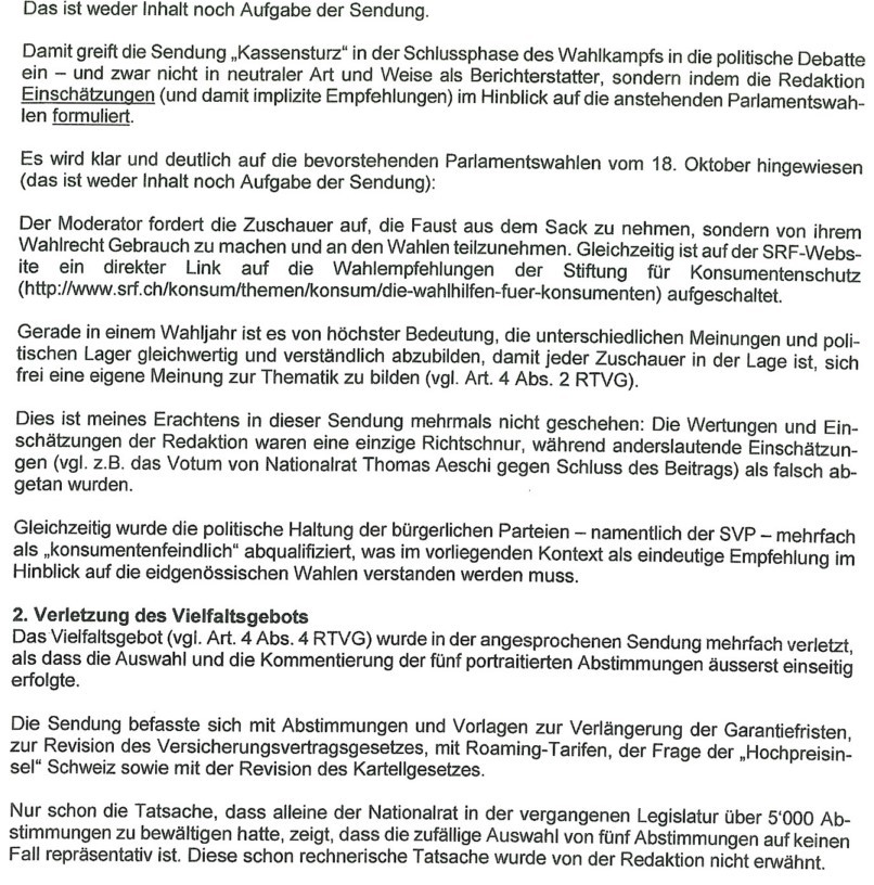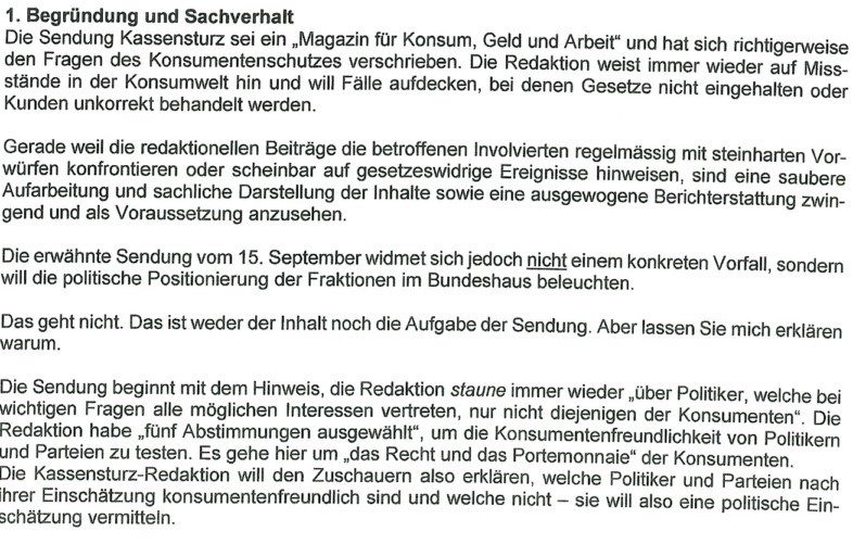 «Kassensturz» hat vor den Wahlen die Parteien nach ihrem Abstimmungsverhalten zu Konsumentenschutz-Themen bewertet. Das ist legitim und sinnvoll. Wir haben dies pointiert getan. Die Zuschauer kennen «Kassensturz» und wissen, dass die Sendung anwaltschaftlich ist und ihre Meinung pointiert vertritt. Die Zuschauer konnten sich eine eigene Meinung bilden, wie die zahlreichen Reaktionen zeigen, die «Kassensturz» widersprechen. Eine Verletzung der Konzession sehe ich nicht. Ich bitte Sie deshalb, Herr Casanova, die Beanstandung als unbegründet abzulehnen“.