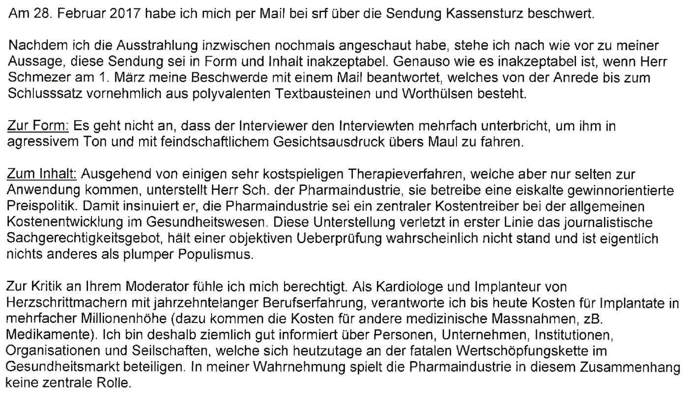 Nach einer für Sie unbefriedigenden E-Mailantwort von Ueli Schmezer auf Ihre E-Mail vom 28.02.2017 haben Sie sich an die Ombudsstelle der SRG.D gewandt. Sie beanstanden darin sowohl Form als auch Inhalt des Interviews von Herrn Ueli Schmezer mit Herrn Thomas Cueni, Generaldirektor des Weltpharma-Verbandes IFPMA.