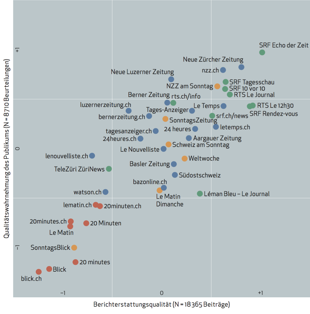 Zur Beurteilung der Berichterstattungsqualität wurden die Gesamtausgaben der jeweiligen Medientitel für das Untersuchungsjahr 2015 untersucht. Aus der Gesamtberichterstattung der Medientitel im Untersuchungsjahr wurde eine repräsentative Stichprobe von 18'365 Beiträgen gezogen, wobei jeder Beitrag von geschulten Codierern nach wissenschaftlichen Konventionen codiert wird (keine automatisierte Qualitätsbewertung).