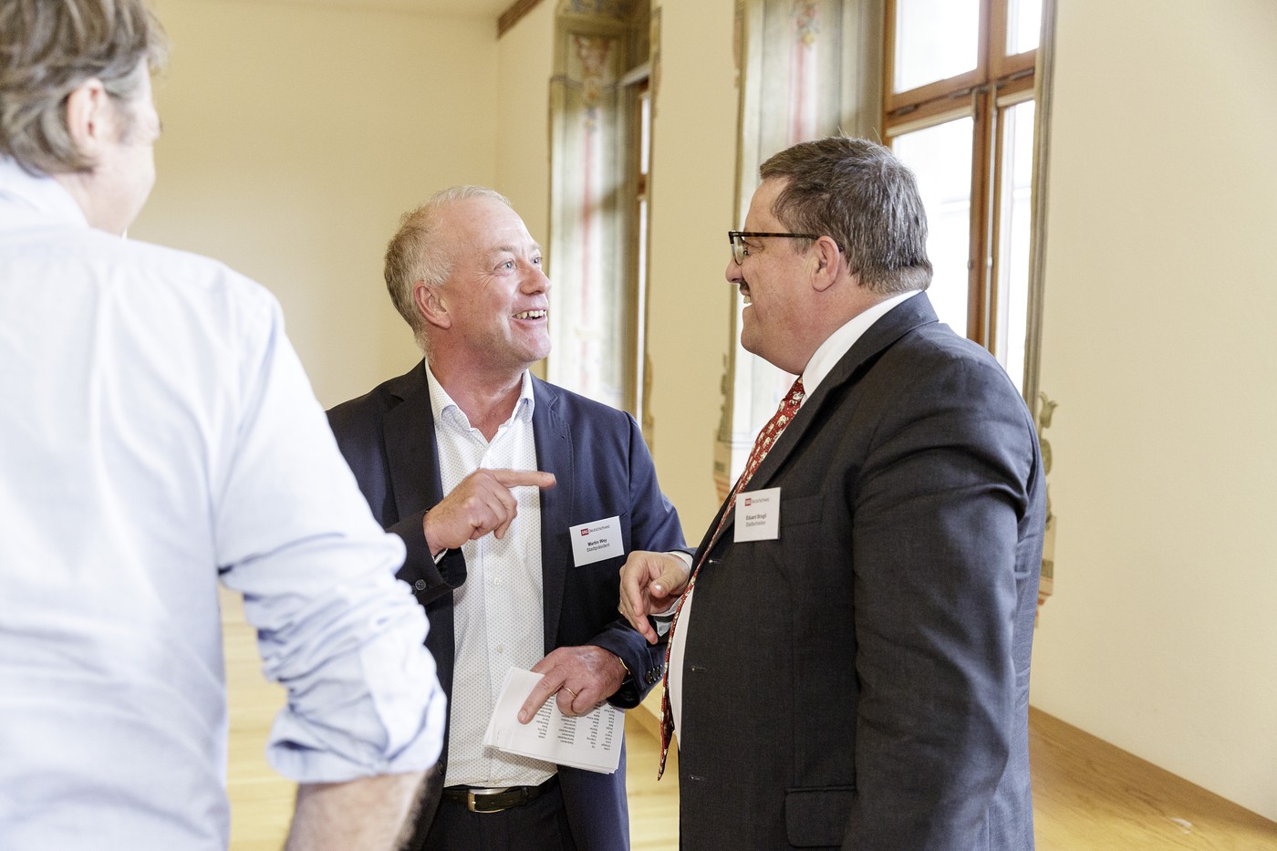 Vertreten waren Stadtpräsidenten von Brig über Münsingen, Olten, Schaffhausen, Pfäffikon und Wil bis nach Glarus. Auch bei den ebenso prominent vertretenen Programmschaffenden von Schweizer Radio und Fernsehen (SRF) fand der intensive Gedankenaustausch sichtlich Anklang. Im Publikum waren etwa SRF-Radioprogrammleiter Röbi Ruckstuhl und Ruedi Matter, SRF-Direktor, die der Debatte interessiert mitverfolgten.