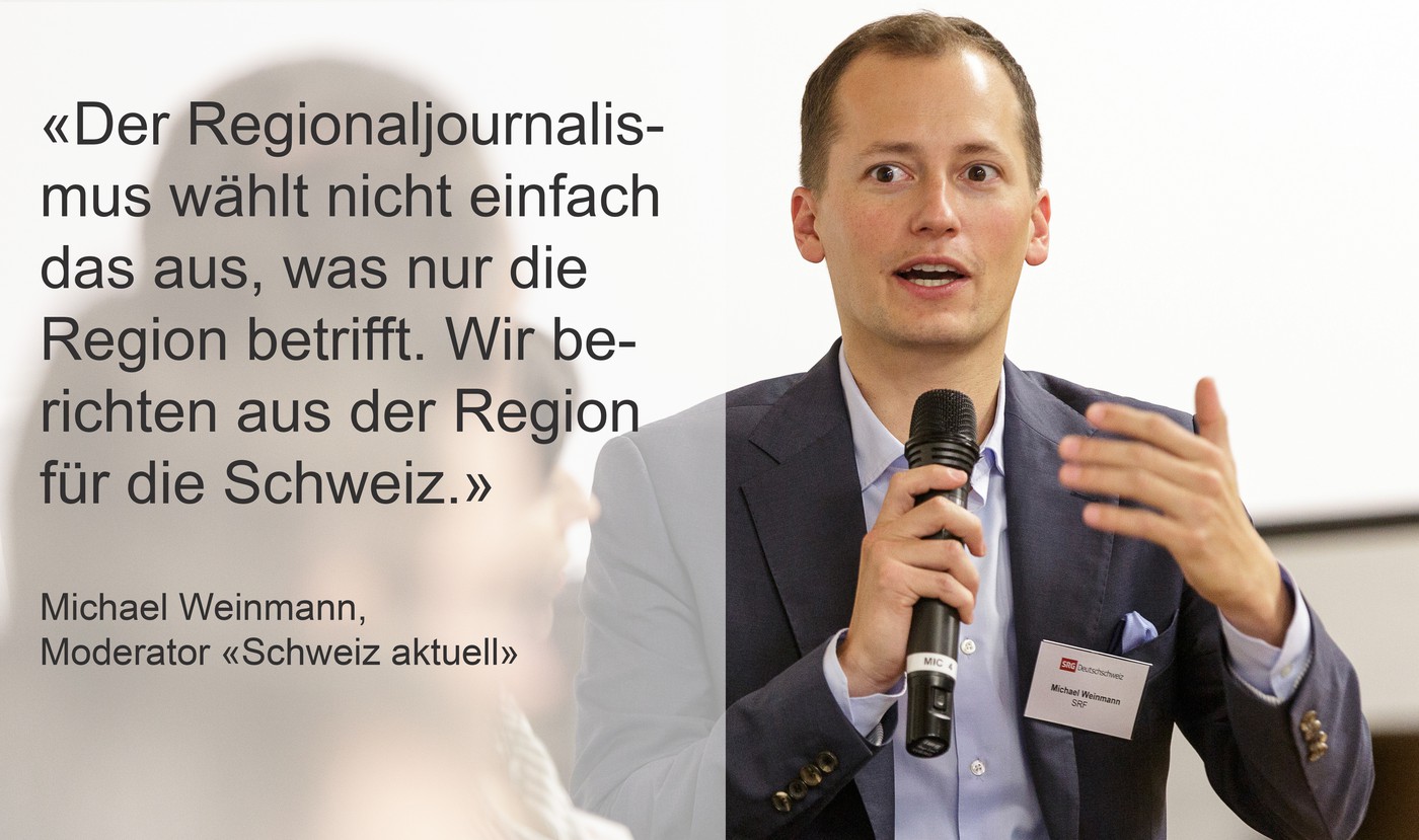 In den beiden Talkrunden trafen zuerst Cathy Flaviano (Tagesverantwortliche, Radio SRF 1), Michael Weinmann (Redaktor und Moderator, «Schweiz aktuell»), Philipp Inauen (TV-Korrespondent Ostschweiz) und Stefan Eiholzer (Leiter Regionaljournal Zentralschweiz) aufeinander und tauschten sich darüber aus, was die Regionalberichterstattung für Journalisten so faszinierend mache, wie das konkrete Agenda-Setting funktioniere und wie sie das Zusammenspiel mit den Städten und Gemeinden erlebten. Weinmann diktierte vom Podium aus sogar seine direkte Telefonnummer, damit keiner sagen könne, er habe seine