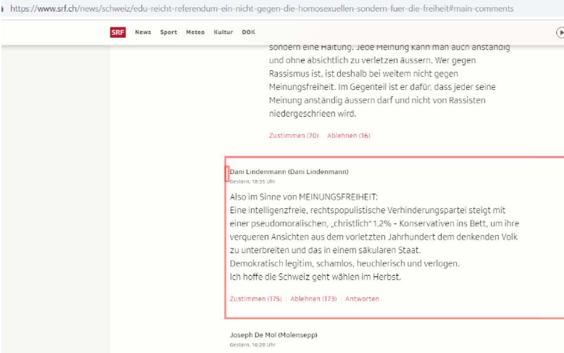 Nutzer-Kommentare zum EDU-Referendum gegen die erweiterte Rassismus-Strafnorm auf «SRF News» beanstandet