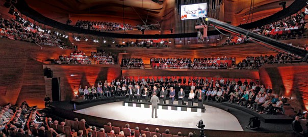 «Natürlich sträubten sich die Politiker erst dagegen, in einer Reihe debattieren zu müssen», sagt Gøtzsche. Sie hätten ihre Mitstreiter besser sehen wollen. Doch die visuelle Ästhetik zugunsten des Zuschauers wurde stärker gewichtet. Die lineare Aufstellung ermöglichte den Kameras spannendere Aufnahmen, mehr Spiel mit Fokussierungs- und Schärfewechseln und vor allem Close-ups der Politiker. «Es sollte ein Big-Visual-Thing werden», sagt Gøtzsche. Und das war es. Lichtsetzung, Schnittkadenz, Szenografie und Dramaturgie machten die Debatte zu einem politischen Spektakel mit ausgeprägtem Unterhaltungscharakter. «Es sah mehr nach einer Oscar-Verleihung aus als nach Präsidentschaftswahl», meint eine Zuschauerin der SRG-Tagung nach einem Ausschnitt kritisch. «Natürlich bekommt eine solche intensive Berichterstattung einen dramatischen Touch», bestätigt Tine Gøtzsche. Inhalt und Unterhaltung müssen jedoch nicht im Widerspruch zueinander stehen, findet sie.