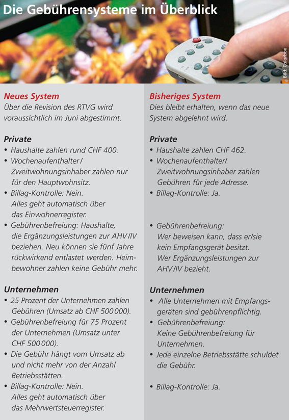 Von höheren Steuern kann nicht die Rede sein: Private Haushalte zahlen neu statt 462 nur noch rund 400 Franken, Zweitwohnungen sind neu in der Gebühr inbegriffen, Altersheimbewohner sind nicht mehr zur Zahlung von Gebühren verpflichtet. Auch die meisten Unternehmen profitieren: Bis zu einem Umsatz von 500 000 Franken zahlen sie nichts mehr. 75 Prozent aller Betriebe sind damit neu gebührenbefreit. Und auch für Unternehmen ab einer halben bis zu einer Million Franken wird es günstiger, sie zahlen rund einen Drittel weniger Gebühr als heute.