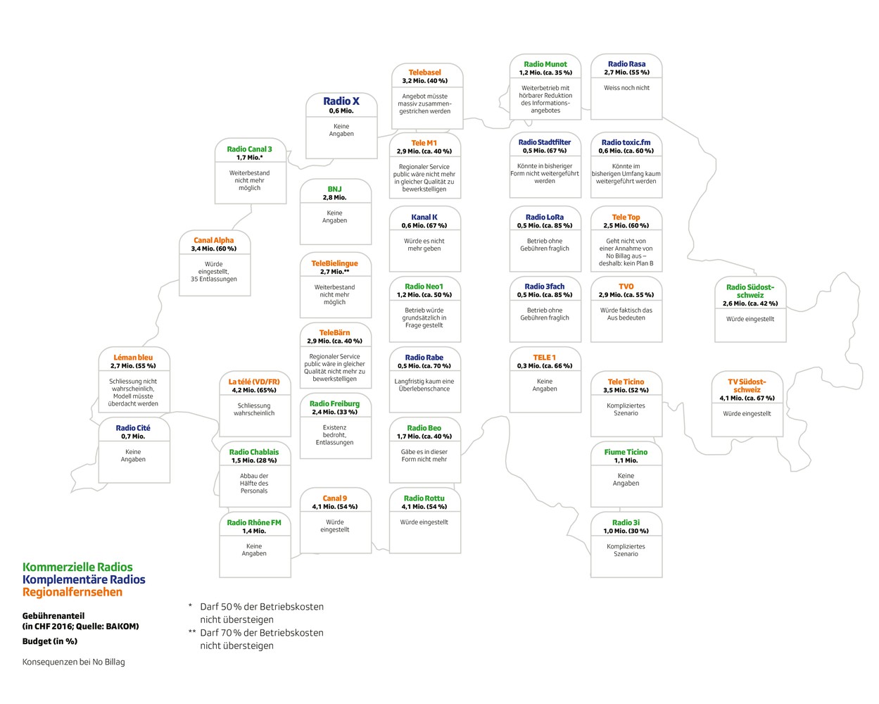 Das Schweizer Medienmagazin EDITO hat die Betreiber der 34 privaten Radio- und Fernsehsender, die Gebührengelder erhalten, gefragt, welchen Anteil ihrer Einnahmen die Gebühren ausmachen und was bei einer Annahme von «No Billag» geschehen würde. Die meisten Sender, insbesondere die regionalen TV-Stationen, wären in ihrer Existenz bedroht.