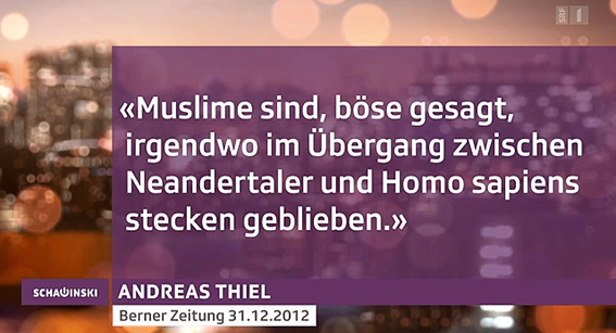 Tatsächlich berichtete Thiel in einem langen Interview mit der «Berner Zeitung» vom 31. Dezember 2012 über seinen Aufenthalt in Südindien und seine Reise im Kaschmir. Auf die Frage, was er damit meinte, dass Muslime nicht dafür bekannt seien, «unseren Humor zu verstehen», antwortete Thiel wie folgt: «Weil sie im Grund genommen gar keinen haben. Wenn du ihre Witze hörst, denkst du dir: Aha, das geht hier unter Humor. Die sind, böse gesagt, irgendwo im Übergang zwischen Neandertaler und Homo sapiens stecken geblieben.»