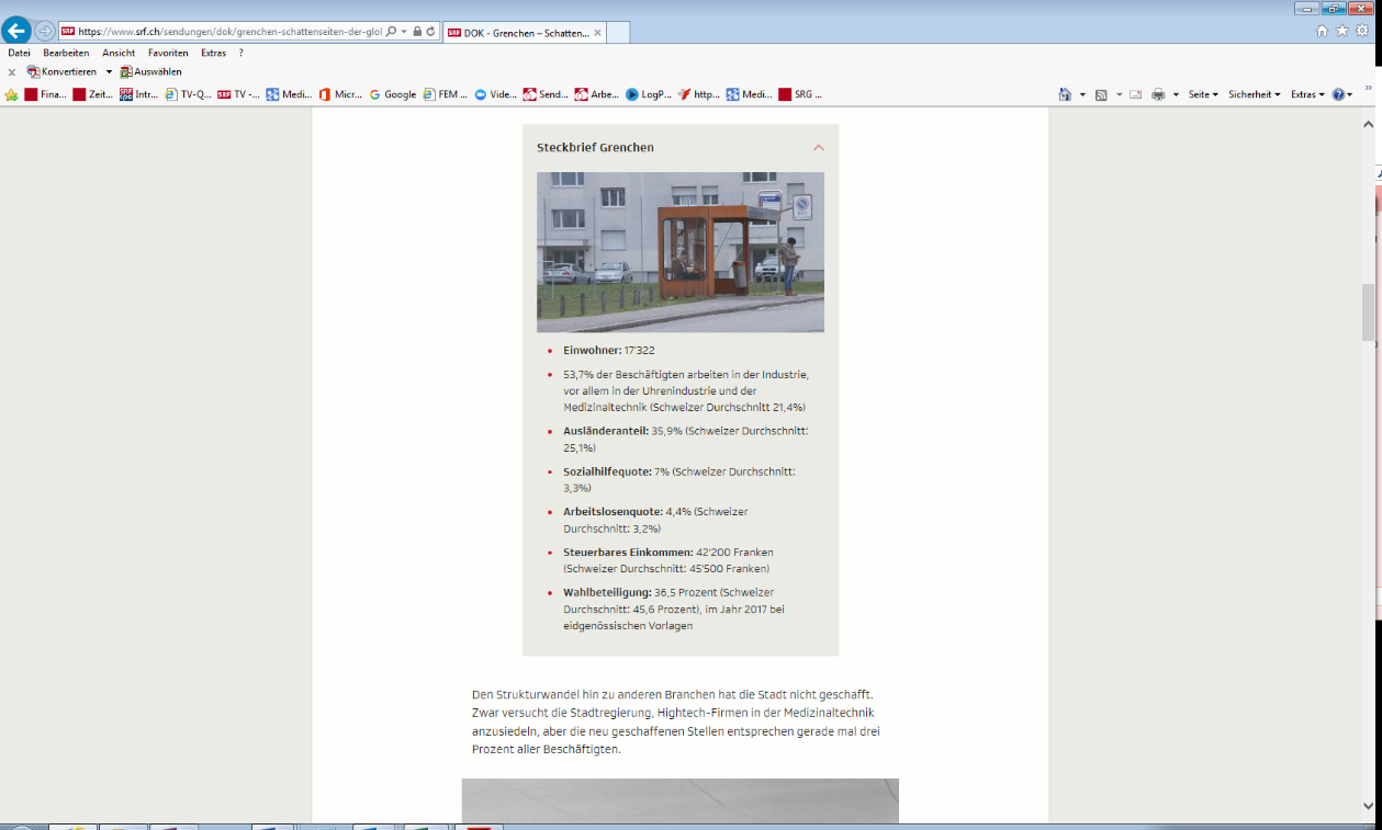 17. zahlreiche Grenchnerinnen und Grenchner lehnten aufgrund der bereits verzerrenden und tendenziösen Absicht das Angebot der Journalistin der Mitwirkung an dieser Sendung ab (als Beispiel: s. Leserbrief von Barbara Zoss im Grenchner Tagblatt [6]. Der Leserbrief beweist, dass die Journalistin nicht durch eine objektive Recherche zum Endresultat gekommen ist, sondern das vorgefasste Ergebnis durch eine einseitig negative Auswahl von Bildern und Äusserungen bestätigen wollte. Die Sendung war von Anfang an darauf ausgerichtet, die Stadt Grenchen und deren Einwohnerinnen und Einwohner als Globalisierungsverlierer, als Stadt der sterbenden Industrie, des tiefen Bildungsniveaus und der resignierten Wähler darzustellen (s.a. Beschreibung des DOK-Films durch die Beschwerdegegnerin, ,‹Milieustudie, Ruhrpott›).