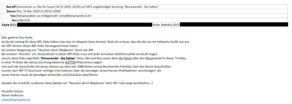 Denn bei ‚DER KLIMAWANDEL.DIE FAKTEN‘ handelt sich im Ursprung um eine BBC-Produktion, die bereits am 12.09.2019 im österreichischem ORF1 und am 17.09.2019 im bundesdeutschen ZDF ausgestrahlt wurde, wobei im ZDF die Inhalte der Sendung von Harald Lesch anstatt von David Attenborough begleitet und kommentiert wurden. David Attenborough war wahrscheinlich auch der Kommentator im BBC-Original von ‚DER KLIMAWANDEL.DIE FAKTEN‘. Genauere Informationen über die BBC-Ausstrahlung sind mir bisher nicht bekannt, mir liegen aber sowohl die ZDF-Ausstrahlung als auch die ORF1-Ausstrahlung vor. Es ist aber anzunehmen, dass die ORF1-Ausstrahlung dem BBC-Original weitestgehend entspricht und nur der Ton/Kommentar deutsch-synchronisiert wurde. Bei der ZDF-Ausstrahlung wurden die Sequenzen aus dem BBC-Original mit David Attenborough aber durch mit Harald Lesch kommentierten und neu-gefilmten aber relativ belanglosen Landschafts-Sequenzen ersetzt, wobei Harald Lesch auch die Kommentierung aus dem OFF aus der BBC-Sendung fürs ZDF teilweise übernommen hatte. Sowohl wegen der ORF1-Ausstrahlung am 12.09.2019 von ‚DER KLIMAWANDEL.DIE FAKTEN‘ als auch wegen der ZDF-Ausstrahlung am 17.09.2019 wurde von mir eine schriftliche Beschwerde sowohl beim ORF1-Beschwerdeausschuss als auch beim ZDF-FERNSEHRAT eingereicht. Die Beschwerden sind zur Nachverfolgbarkeit für die sehr interessierte Öffentlichkeit auf unserer Klimamanifest-Webseite online gestellt.[1] Es findet sich dort auch die Beschwerde über ‚DER KLIMAFORSCHER‘, die mittlerweile bei der UBI in Bern zur Bewertung eingereicht worden ist (Beschwerde #03). Die Beschwerde über ‚DER KLIMAFORSCHER‘ kritisiert ebenfalls das bewusste und vermeintlich vorsätzliche Weglassen wichtiger Informationen gegenüber dem TV-Zuschauer, was aktuell auch vom SRF am 14.11.2019 in der 50-minütigen Dokumentation ‚DER KLIMAWANDEL.DIE FAKTEN‘ in untragbarer Art und Weise erneut praktiziert wurde. Dem SRF ist seit dem 25.10.2019 im Vorfeld der angekündigten Ausstrahlung im SRF von ‚DER KLIMAWANDEL. DIE FAKTEN‘ mein folgendes Mail bekannt, [Abb. 02]: