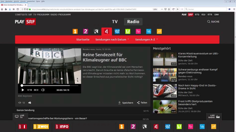 Die kritiklose Übernahme und Ausstrahlung der BBC-Dokumentation ‚DER KLIMAWANDEL.DIE FAKTEN‘ durch das SRF ist auch zusätzlich bedenklich, weil dem SRF bekannt ist, dass die BBC verkündet hat, Kritik am ‚Klimawandel‘ nicht mehr zu Wort kommen lassen zu wollen, worüber das SRF am 03.05.2019 in einer Hörfunk-Sendung berichtet hatte, [Abb. 08]: