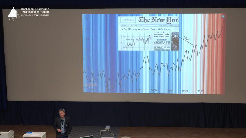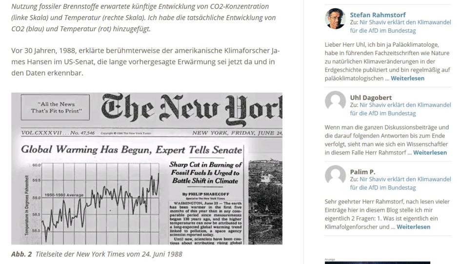 Stefan Rahmstorf verschweigt in seinem Vortrag, dass James Hansen in dieser NYTGrafik einen aktuellen globalen Absoluttemperaturwert für 1988 von 15.4°C (= 59.7°F) ausgewiesen hatte und mit diesem nachweislich damals um ca. 1°C überhöhten globalen Absoluttemperaturwert damit die Gefährlichkeit der Erderwärmung bei seiner Anhörung im US-Kongress begründet hatte. Auch auf seiner Webseite verwendet Stefan Rahmstorf argumentativ ebenfalls diesen Ausschnitt aus der NEWYORK-TIMES, [Abb. 06], ohne allerdings seine Leser auf diesen damals von James Hansen verwendeten überhöhten globalen Absoluttemperaturwert hinzuweisen und darüber aufzuklären: