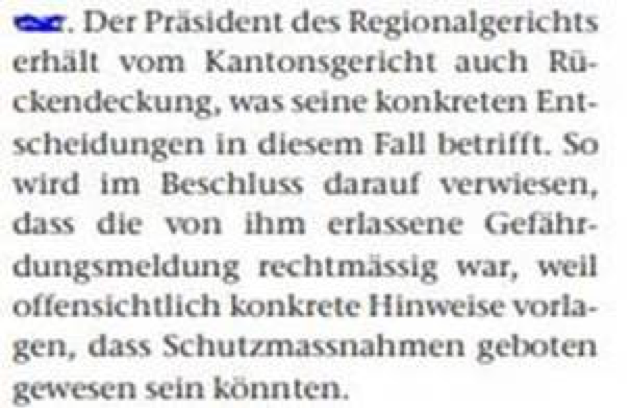 Tatsache ist: Richter Zegg hat 2015 nach einer Email von AQ mit Suiziddrohung eine Gefährdungsmeldung an den Bezirksarzt gemacht. Das Kantonsgericht hat im Entscheid vom 15. Oktober 2018 ausdrücklich festgehalten, diese Gefährdungsmeldung sei nicht nur zurecht erfolgt, es hat in der Erwägung 5.4 sogar auf die gesetzliche Pflicht zur Meldung hingewiesen.[2] Ja, das Kantonsgericht hält dort sogar fest, eine solche Gefährdungsmeldung diene dem Schutz der gemeldeten Person und stehe damit grundsätzlich in deren wohlverstandenem Interesse.