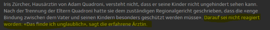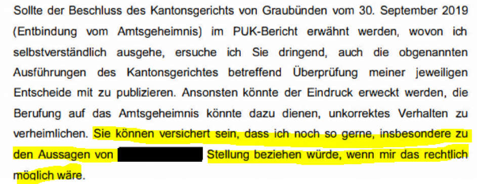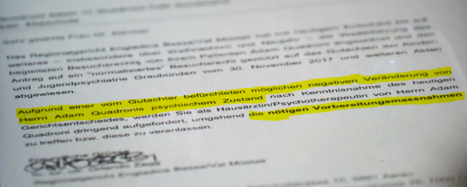 Dem oben abgedruckten Schreiben kann im oberen Teil (über dem gelb markierten Text) entnommen werden, dass Richter Zegg auch die von der Moderatorin genannten, unbegleiteten Besuche der Kinder über die Feiertage nicht aus hohlem Bauch ablehnte, sondern wiederum gestützt auf ein Gutachten der Kinder- und Jugendpsychiatrie Graubünden vom 30. November 2017, wie er im Schreiben ausdrücklich erwähnt. Unter diesen Vorgaben ist die Aussage <Heute ist anzunehmen, dass er (Richter Zegg) auf dieser Basis versuchte, Adam Quadroni, kurz vor Weihnachten erneut in der Psychiatrie zu versorgen> einfach ein Hohn.