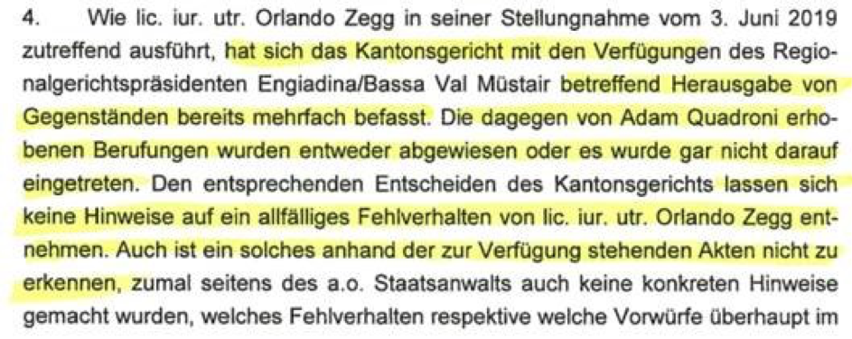 7. Sie kritisieren, dass Alt-Bundesrichter Giusep Nay und Anwalt Angelo Schwizer Quadroni breit verteidigen und dass Schwizer Richter Zegg anschwärzen darf, während Gegenstimmen fehlen. Zegg habe Vorsorgemassnahmen gestützt auf Kinder- und Jugendpsychiatrie getroffen. Außerdem sei Zegg durch Kantonsgerichtsentscheide gestützt worden.