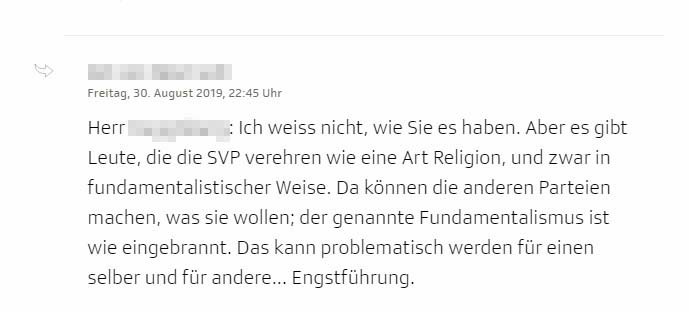 «Vorwort. Lange überlegte ich wie ich gegenüber SRF den gebührenden Respekt zeigen kann. Wie ich nur eine Wortwahl wähle, welche bei SRF Begeisterung auslöst. Die Lösung: Ich benutze sehr gerne nur Worte und Aussagen welche sich einer strengen Kontrolle der Netiquette vom Schweizer Fernsehen unterziehen mussten. Und diese Kontrolle problemlos meisterten. Es ist mein Zeichen des Respektes gegenüber SRF, dass ich nur diese Wortwahl benutze, welche SRF mit Freudensprüngen bei Linken Kommentarschreibern erlaubt.